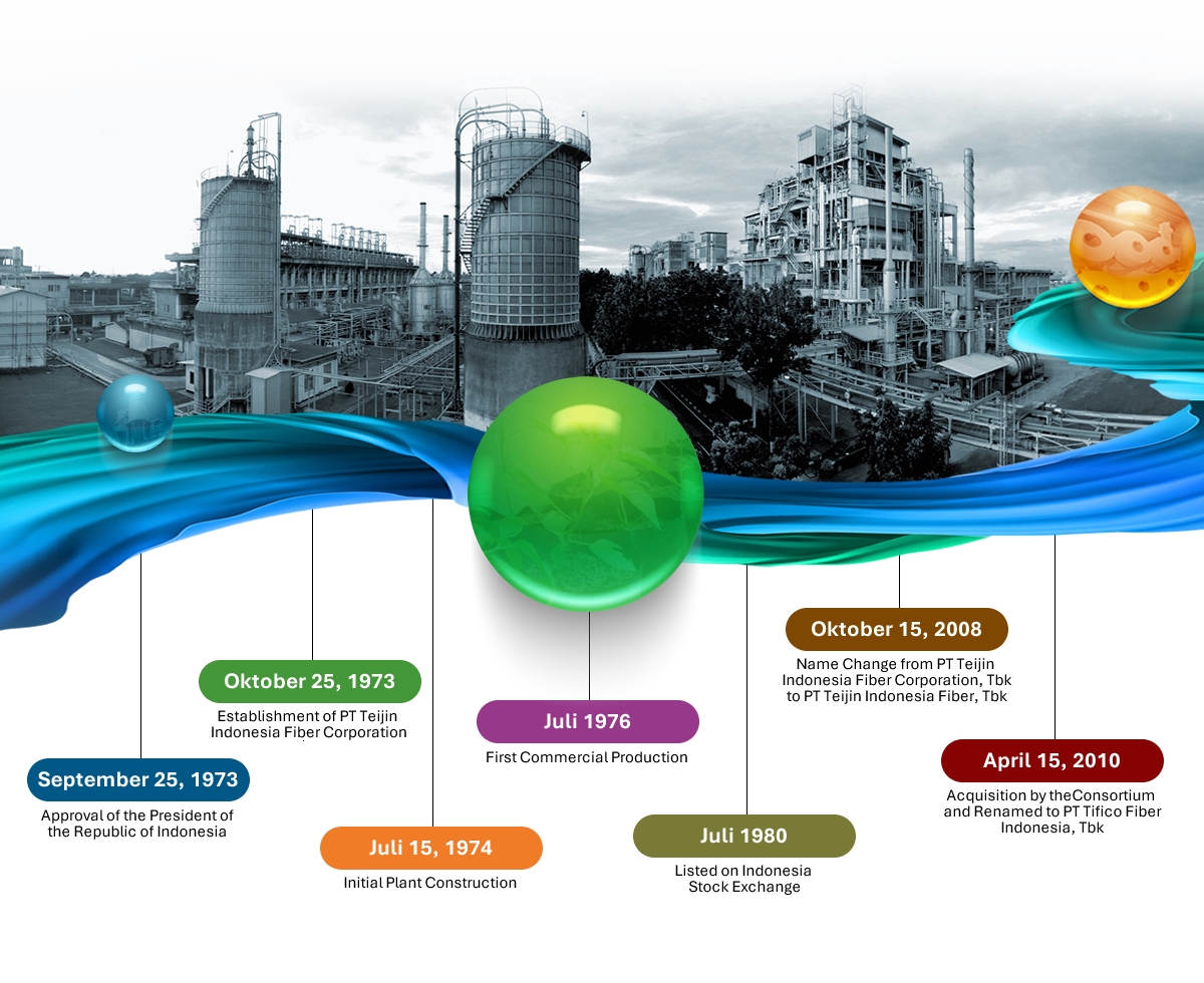 PT Tifico Fiber Indonesia, Tbk. was originally established as PT Teijin Indonesia Fiber Corporation. The approval for its establishment was granted by the President of the Republic of Indonesia on September 25, 1973, and it was officially founded on October 25 of the same year. Initial construction commenced on July 15, 1974, and by July 1976, the company initiated its first commercial activities. On February 26, 1980, the company became listed on the Indonesia Stock Exchange with the stock code TFCO. Subsequently, on April 15, 2010, the company underwent acquisition by a consortium, leading to its name change to PT Tifico Fiber Indonesia, Tbk, a name it holds to this day.